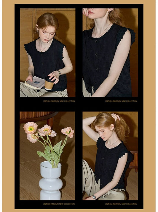 Kuhnmavie Korean Style Pleated Sleeveless Shirt for Women, 2026 Early Spring New Style, High-End Niche Top