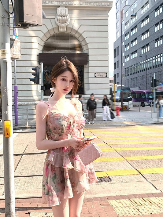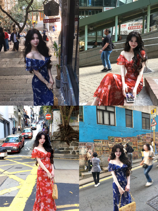 Chien Che's French-style chiffon floral dress, spring/summer, sophisticated and sexy, slit ruffle halter dress for women.