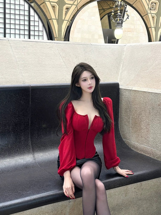 Chill, a French-style short chiffon red heavy-duty herringbone shirt, made by Du Jia, is flattering and makes you look fairer.