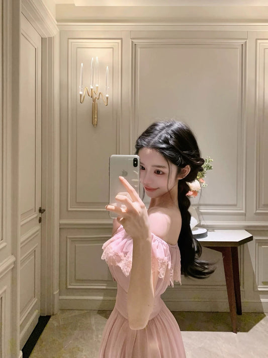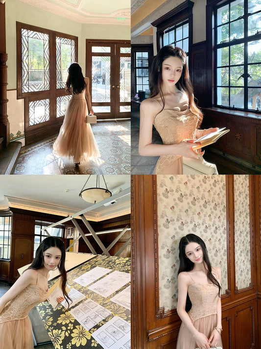 Hotdog is hot! 【Mermaid Dance】Lace-trimmed tulle Korean style fitted waist elegant suspender dress