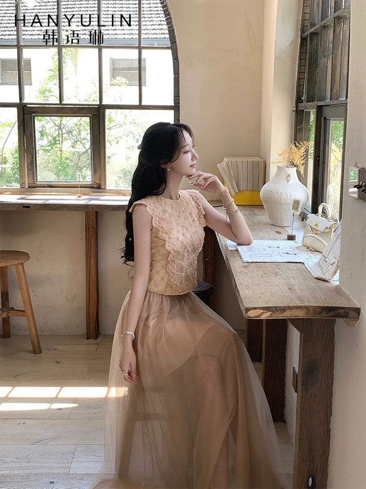 Han Yulin French-style 3D floral lace top and mesh skirt two-piece set for women, spring style.