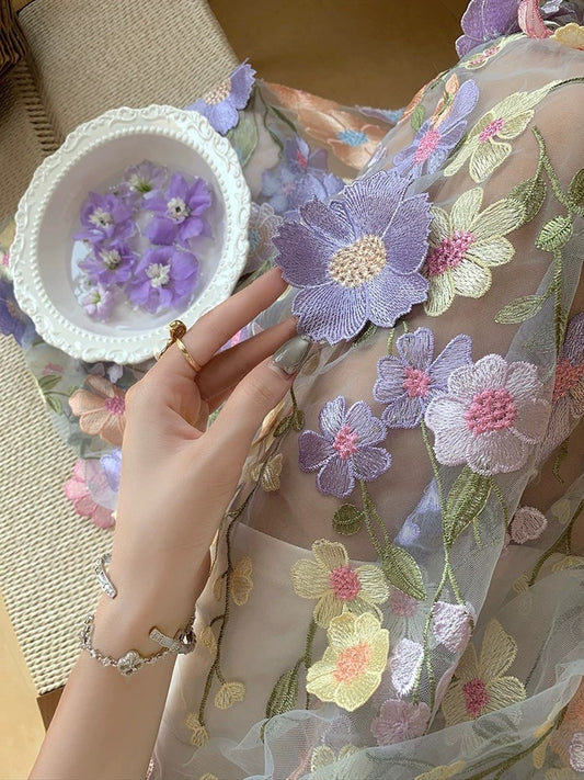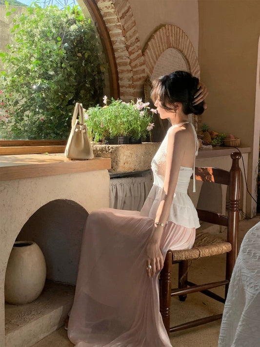 Han Yulin's exquisite 3D floral Mori-style halter maxi dress, romantic and ethereal for vacation.