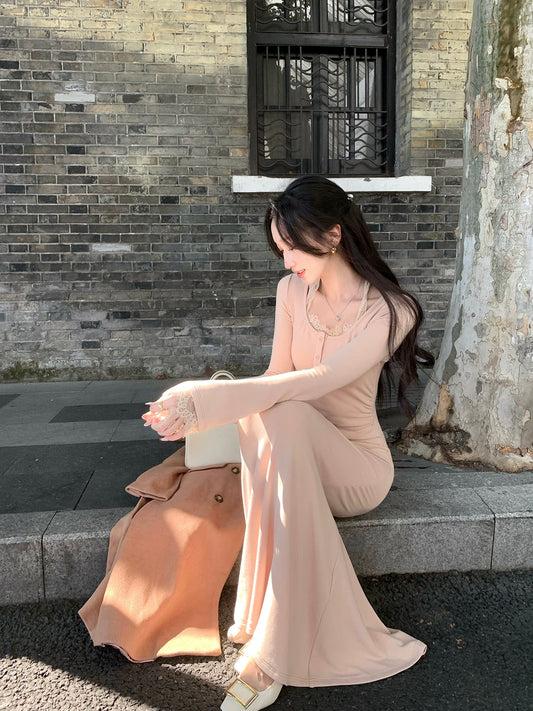 Han Yulin/High-elastic knit lace halter neck faux two-piece fishtail dress, spring slim fit elegant long dress