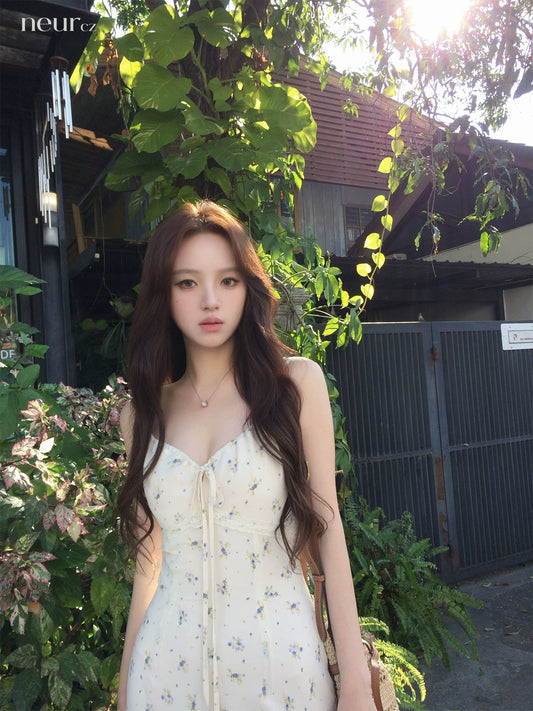 neurcz Long Floral Print Sundress for Women, Spring Style, Drawstring Waist-cinching, Slimming, A-line French Skirt