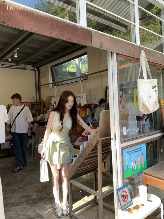 neurcz Knitted V-neck Short Color-blocked Floral Dress Women's Spring Short Cardigan Slimming Waist Two-Piece Set
