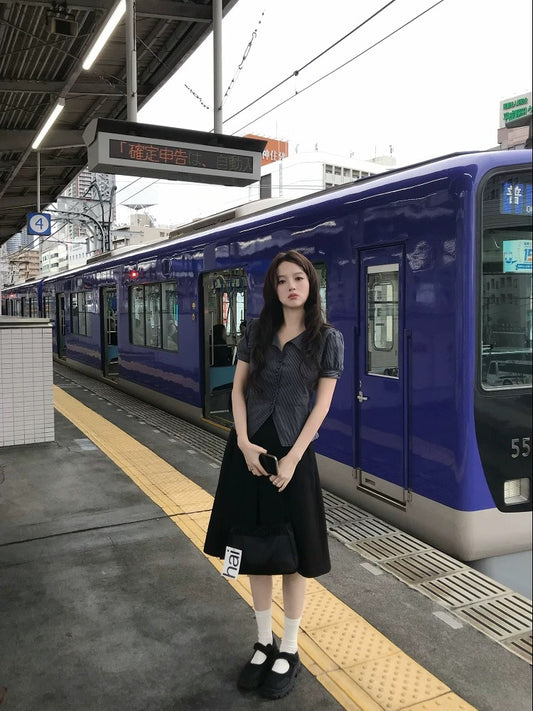 neurcz Black and White Striped Collared V-Neck Slim Waist Retro Shirt Women's Summer Design Puff Sleeve Niche Top