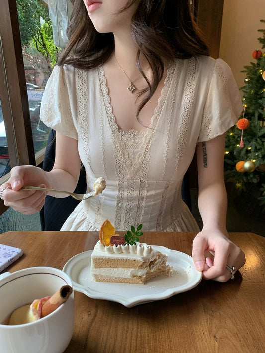 neurcz Beige lace-trimmed retro-style short dress, summer-appropriate, waist-cinching design, gentle and feminine white dress.
