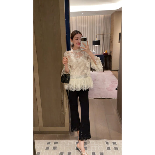 AOMALM's "London Student" % Pure and Sexy Long-Sleeved Lace Hollow-Out T-Shirt Women's Autumn Ruffle Top