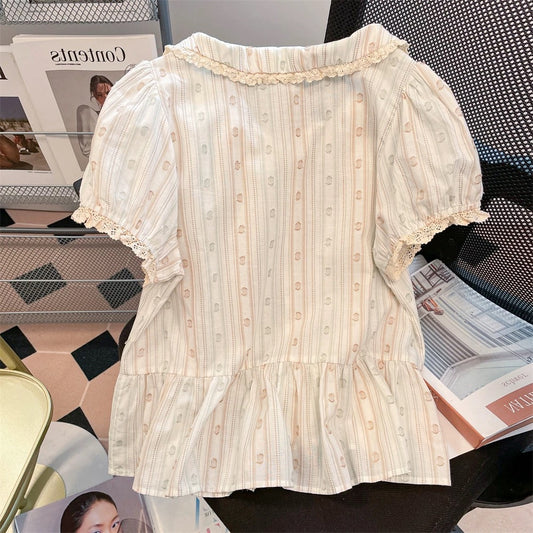 French retro sweet striped Peter Pan collar shirt, new summer style for men and women, youthful and fashionable short puff sleeve top
