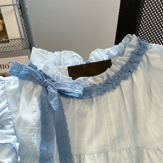 Petite sweet and cute bow tie embroidered shirt, new summer style for men and women, slimming lace collar short top