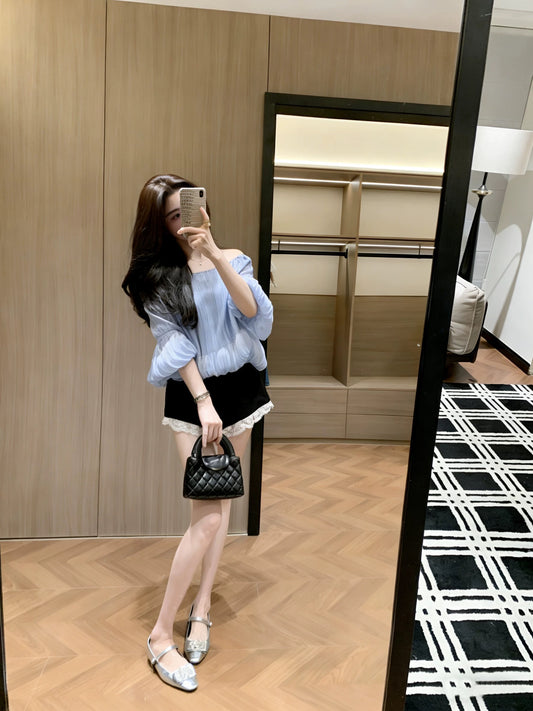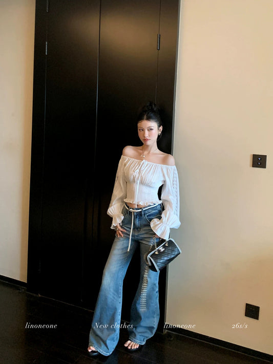Women's white short-sleeved shirt, summer 2025 new style, design, off-shoulder, loose fit, sun protection, small flutter sleeves, top.