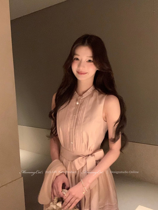 Mummy Cat, the Egg-Laying Cat - New Sweet Pleated Striped Tie-Waist Sleeveless Dress