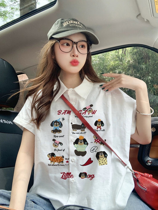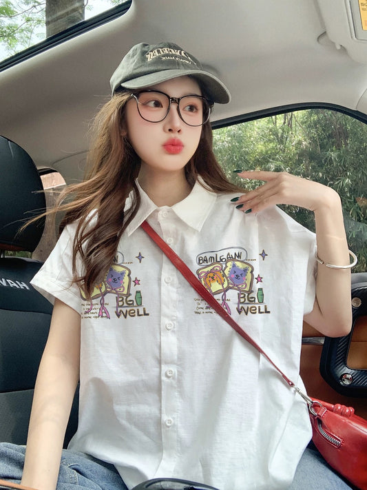 White cartoon short-sleeved shirt for women, summer 2025 new style, loose and casual, trendy brand niche top/shirt.