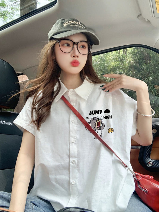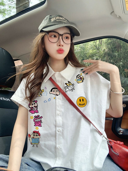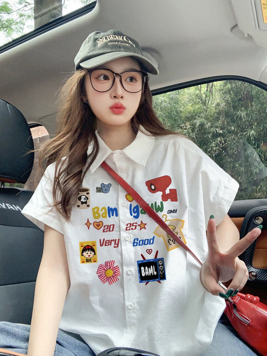 Women's white short-sleeved shirt with cartoon shoulder design, summer loose retro style, youthful and casual, suitable for couples.