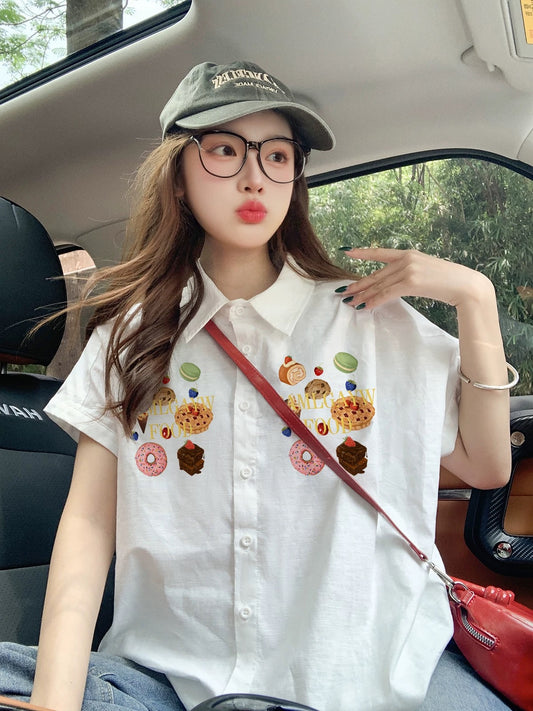 Trendy cartoon white short-sleeved shirt for women, loose and relaxed style, unique design with flutter sleeves, perfect for summer.