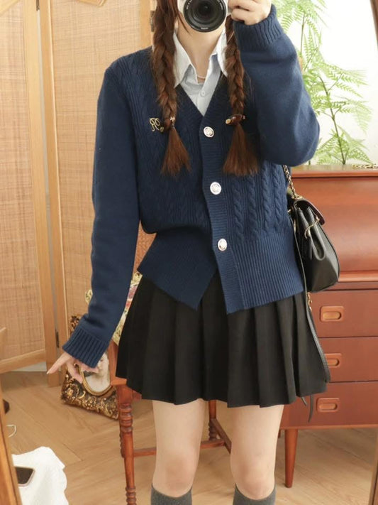 Vendor:mymystyle94Regular price $24.00 USDRegular priceUnit price / perSale price $24.00 USDAutumn/Winter Retro Preppy Style Navy Blue Embroidered Letter V-Neck Cable Knit Sweater Cardigan for Women F 8704
