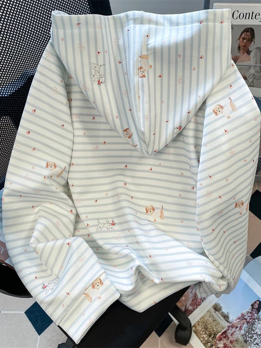Artistic striped hooded sweatshirt with drawstring, perfect for early autumn, Korean style, with a soft, relaxed feel