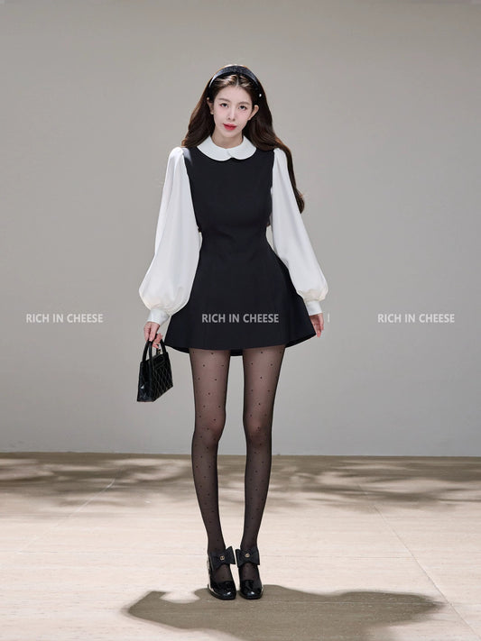 Shu Hulei, a college heiress, wears a French-style A-line vest dress with a overlapping collar and color-blocked design.