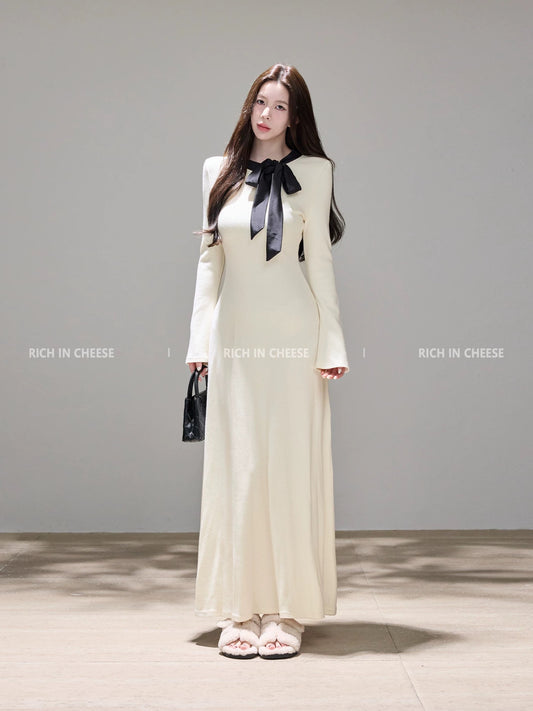 Shu Hulei White Butterfly French Style Bow Tie Color Block Long Knitted Dress for Women (Winter)