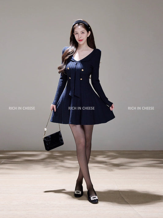 Shu Hulei, a returned noblewoman, V-neck tie-waist Chanel-style knitted dress, slimming pleated skirt.