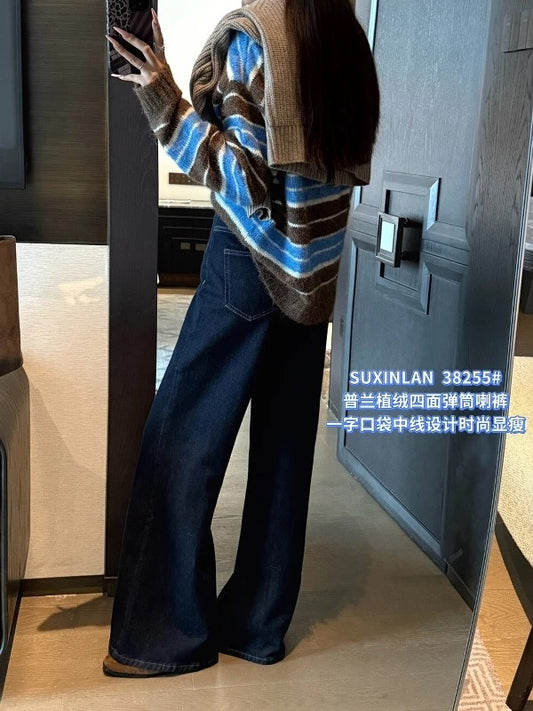 SUXINLAN Korean Style Retro Thickened Versatile Slimming High-Waisted Flared Jeans for Women, Winter Style