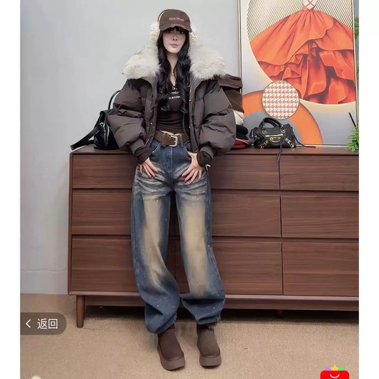 American Retro Straight Leg Jeans for Women, Winter Fleece Lined Loose High Waist Wide Leg Pants