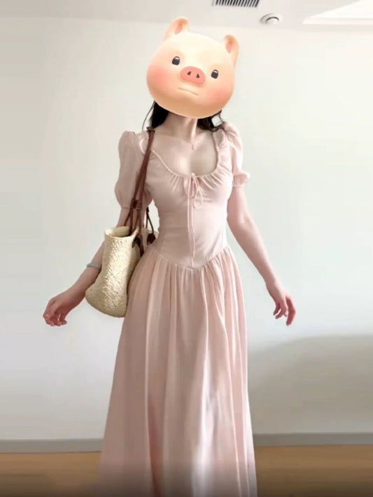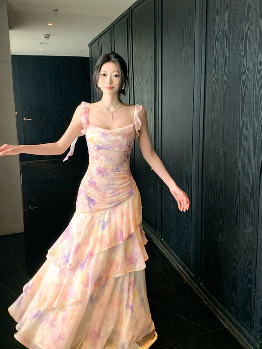 Good Job! 【Floral Banquet】French Pink Floral Print Sundress with Ruffled Ribbon - Fairy-like Long Dress