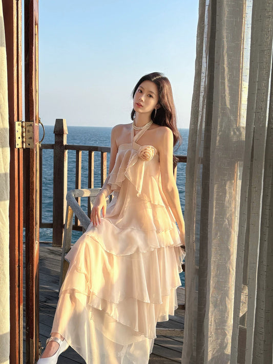 Good Job! 【Camellia Left Bank】French Heavy-Duty 3D Rose Sleeveless Halter Neck Dress with Irregular Long Skirt