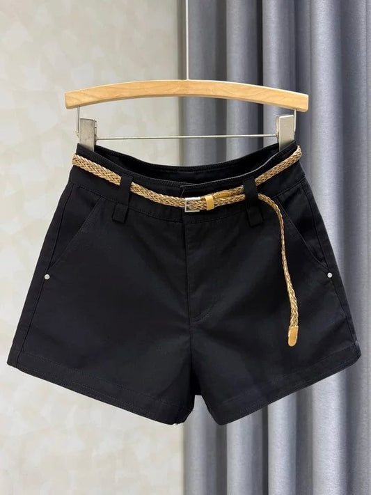 White solid color versatile high-waisted denim shorts, new summer style, loose fit, slimming wide-leg, rolled-up hem, casual hot pants.