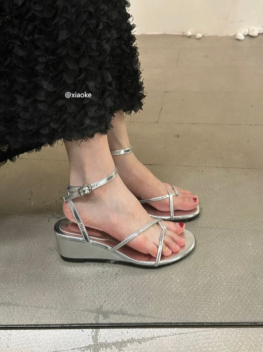 Women's wedge silver flip-flops, perfect for summer, new style, French-style sandals, thick sole, stunning!