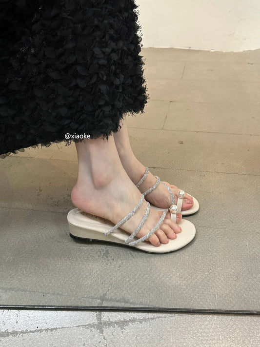 French-style exquisite flip-flops for women, perfect for summer wear, flat, 2025 new style, suitable for pairing with skirts, mid-heel sandals.