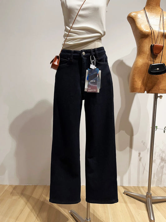 Casual high-waisted wide-leg jeans for women, slimming straight leg pants with fleece lining, perfect for winter.