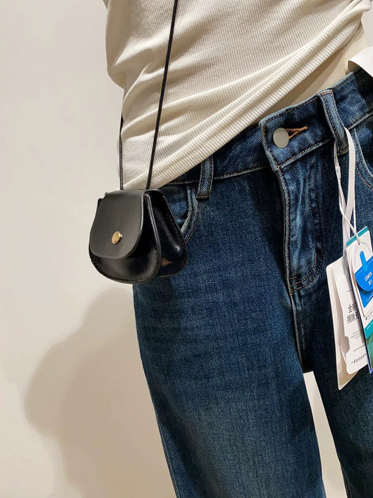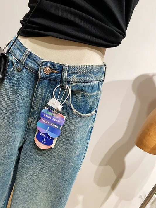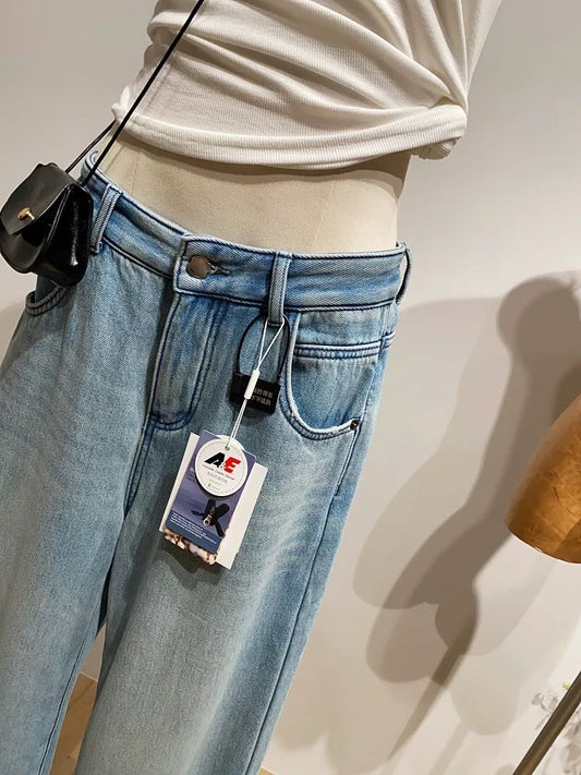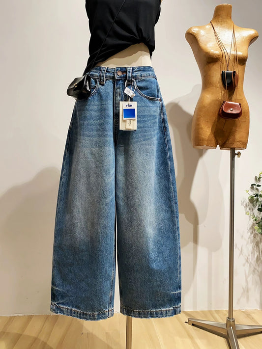 High-end retro high-waisted curved jeans for women, loose fit, slimming cropped pants for spring.