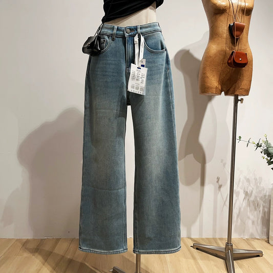 Retro high-waisted wide-leg jeans for women, winter fleece-lined, casual, slimming straight leg pants
