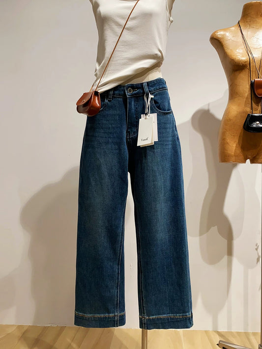Women's washed blue wide-leg jeans, loose fit, slimming, high-waisted, cropped straight leg pants for spring and autumn.