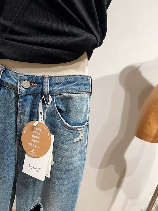 Ripped Wide-Leg Jeans for Women, Spring/Summer, Korean Style, Loose Fit, Slimming Straight Leg, Floor-Length Pants