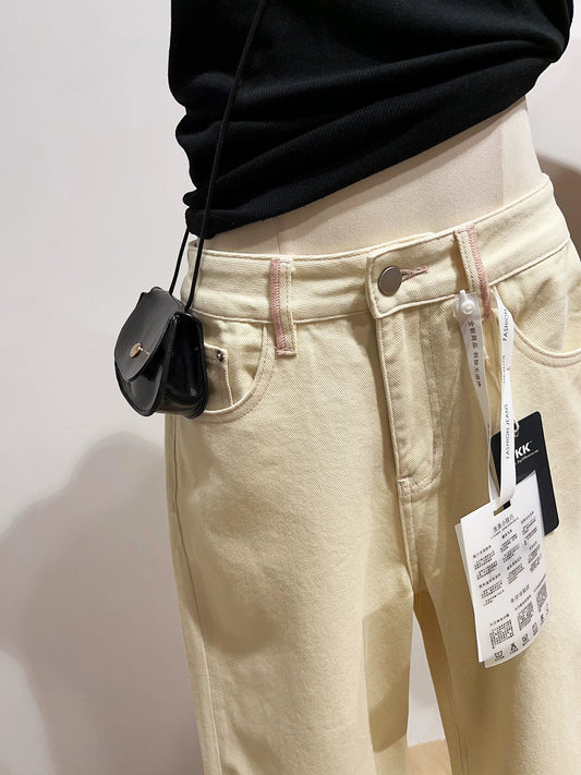 Casual high-waisted wide-leg jeans for women, loose fit, slimming, creamy yellow straight leg pants for spring and autumn.