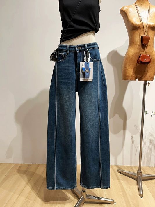 Dark blue fleece-lined straight leg jeans for women, winter retro high-waisted loose wide-leg pants