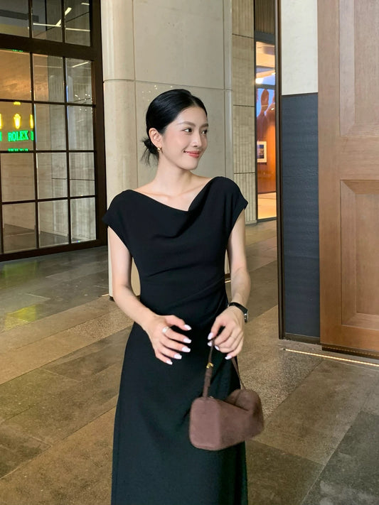 IAMJAM "Elegant Black Dress" 2026 Summer New Mid-Length Slimming A-line Waist-cinching Dress for Women