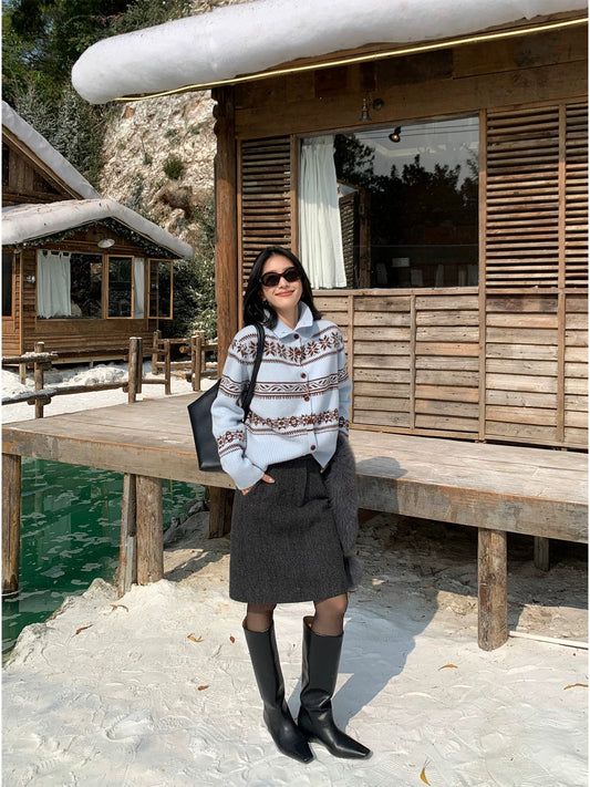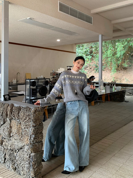 IAMJAM Wool Snowflake Fair Isle Textured Knit Sweater for Women, Autumn/Winter, Blue Atmosphere Style, Slimming Inner Layer Top