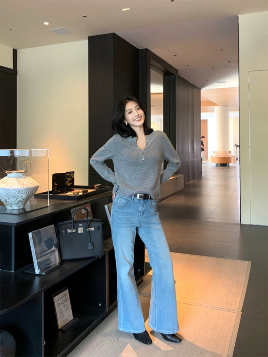 IAMJAM Light Blue High-Waisted Flared Pants for Women, New Spring Style, Slimming and Stylish, Versatile Jeans