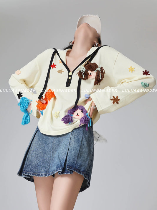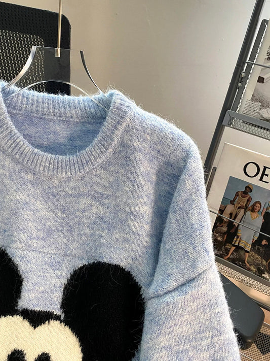 Lazy high-end cartoon pullover sweater for women autumn and winter outer wear loose design niche fake two-piece knitted top