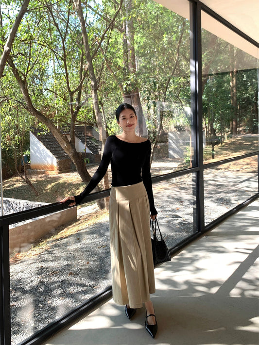 IAMJAM "Evening Breeze Khaki Midi Skirt" - Early Spring Elegant High-Waisted Pleated Skirt, Slimming Long Skirt for Women