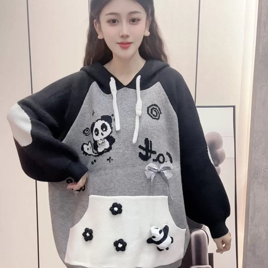 Lazy style loose hooded cute cartoon sweater cardigan jacket women's autumn and winter outer wear 2025 new age-reducing tops
