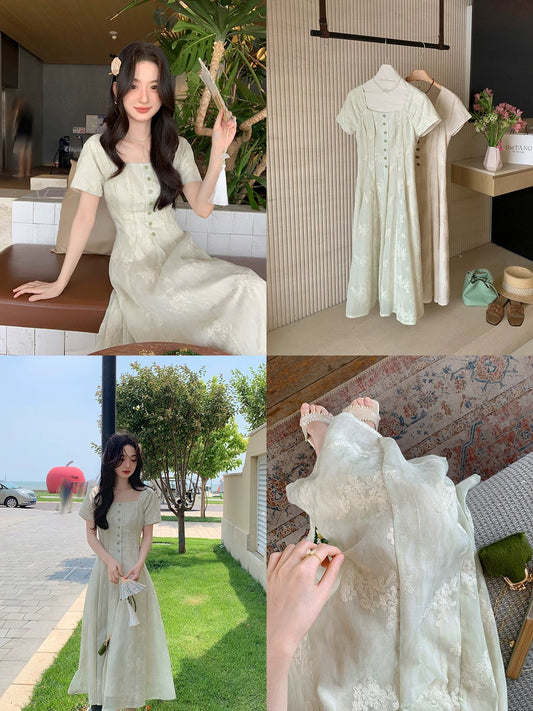 Miss Chipmunk's Poetic Style: Elegant and Feminine Summer Dress with a Slim Fit and Light Chinese Style Patchwork Design