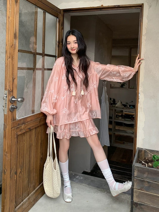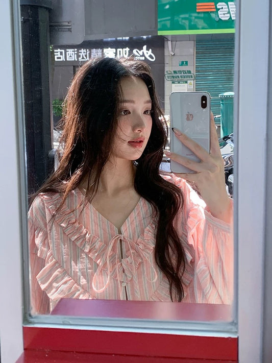Find the perfect pink ruffled tie-waist long-sleeved shirt for women, a new spring style for 2026, featuring a relaxed, loose French-inspired look.