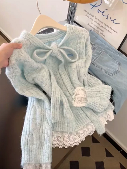 Lulu's Korean-style pretty early autumn sweater, new autumn style, elegant lace knit design, long-sleeved knitwear.