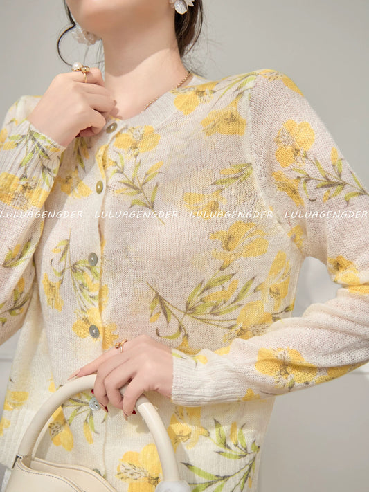 Lulu's style, fashionable, versatile, slimming yellow floral knitted cardigan, new autumn/winter style, chic long-sleeved top.