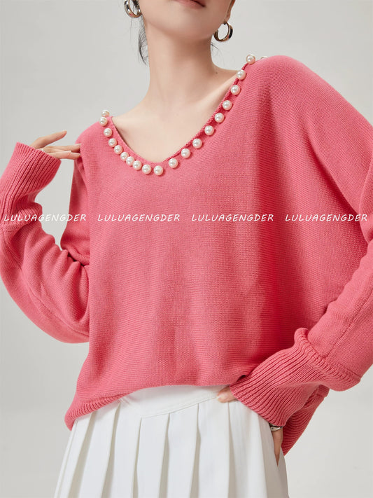 [In Stock] Lulu's style sweater, relaxed and sophisticated, 2025 autumn, pearl-trimmed V-neck soft knit sweater