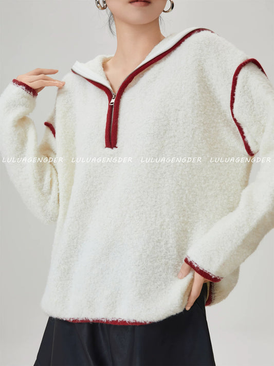 A must-have! This French-style color-blocked striped collared knit sweater is a new autumn/winter style, featuring a relaxed, loose fit and soft texture.
